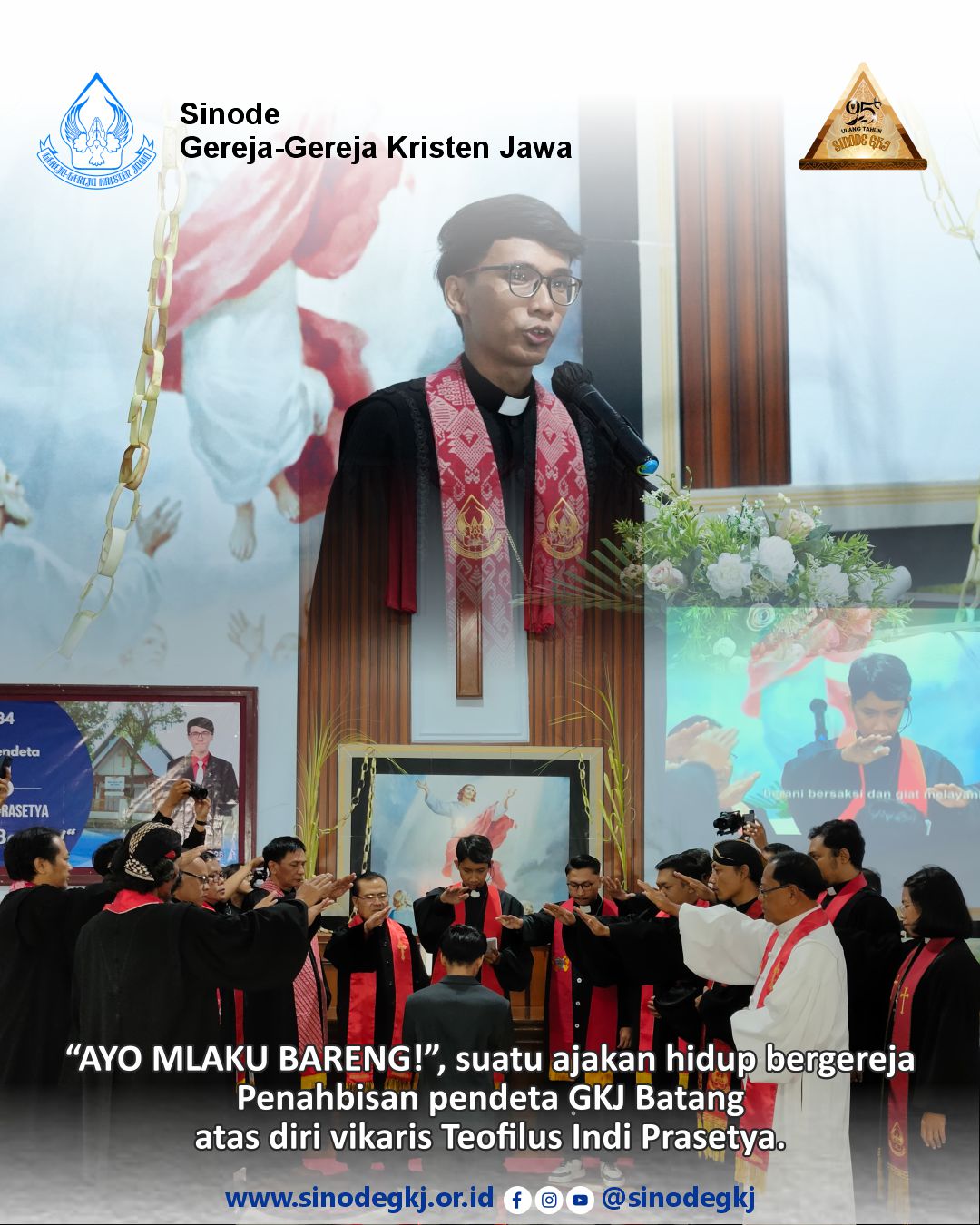 “AYO MLAKU BARENG!”, suatu ajakan hidup bergereja.Pada hari Jumat, 24 April 2026 bertempat di Gedung GKJ Batang telah dilaksanakan Ibadah HUT ke-34 danpenahbisan pendeta GKJ Batang atas diri vikaris Teofilus Indi Prasetya. Ibadah dilayani oleh Pdt. Dwi ArgoMursito (GKJ Pekalongan) sebagai pendeta konsulen dan dihadiri oleh para pendeta lingkup GKJ KlasisPekalongan, pendeta tamu, visitator Sinode GKJ serta para tamu undangan. Khotbah sulung Pdt. TeofilusIndi Prasetya memilih tema: ”Ayo Mlaku Barang” bersumber dari bacaan Mateus 4:18-22. Dalamrefleksinya Pdt. Teofilus merasa tidak akan sanggup jika hanya berpelayanan seorang diri tanpa kesediaandari keluarga besar GKJ Batang untuk berjalan bersama. AYO MLAKU BARENG!.
