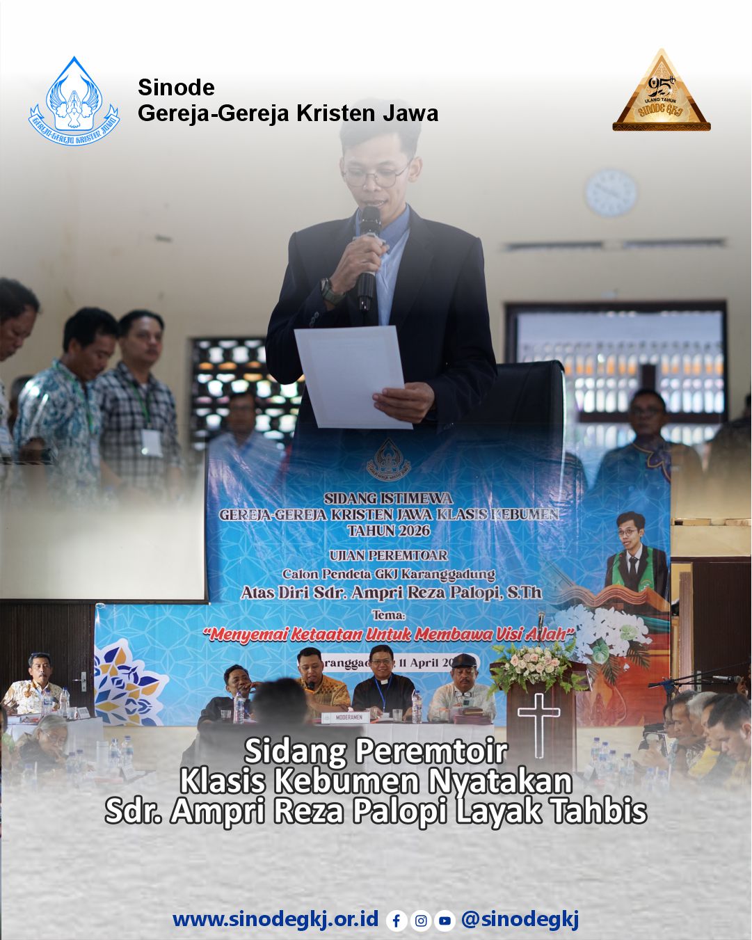 Calon Pendeta GKJ Karanggadung Dinyatakan Layak TahbisKEBUMEN – Suasana khidmat menyelimuti GKJ Karanggadung pada Sabtu (11/4/2026), saat Klasis Kebumen menggelar Sidang Istimewa Ujian Kependetaan (Peremtoir) bagi Sdr. Ampri Reza Palopi, S.Th.Rangkaian kegiatan diawali dengan ibadah pembukaan yang dipimpin Pdt. Erni Ratna Yunita, M.Si. Dalam khotbahnya berdasarkan 1 Korintus 3:7-13, ia menegaskan bahwa inti pelayanan bukan terletak pada siapa yang bekerja, melainkan pada Tuhan yang memberi pertumbuhan. “Tugas gereja adalah setia mengerjakan bagiannya, sementara pertumbuhan adalah karya Allah,” pesannya.Kebersamaan terasa dalam sesi sambutan. Kepala Desa Karanggadung, Bp. Sakimin, menegaskan komitmen pemerintah desa untuk menjaga keterbukaan dan mendukung kehidupan beragama. Sejumlah tokoh gereja juga menyampaikan sambutan, di antaranya Ketua Majelis GKJ Karanggadung Pnt. Sujiman, Visitator Sinode GKJ Pdt. Udin Firman Hidayat, S.Si.Teol.,M.Pd, perwakilan Bapelklas Kebumen Pdt. Dadang Andi Sasanto, S.Th., serta mewakili klasis tetangga yaitu utusan Klasis Banyumas Selatan, Pdt. Chrisma Okta Wulandari.Memasuki agenda inti, sidang memilih moderamen yang akan memimpin jalannya persidangan. Terpilih Pdt. Prima Adicahyo, S.Si. (Ketua I), Pdt. Andreas Sapto Edi, S.Si. (Ketua II), Pdt. Sarwanti, S.Si. (Sekretaris I), dan Pdt. Andreas Restu Priyatama, S.Th. (Sekretaris II).Dalam ujian, Sdr. Ampri Reza Palopi, S.Th. diuji secara komprehensif menggunakan model parsial, meliputi materi khotbah, Pokok-Pokok Ajaran GKJ, Tata Gereja dan Tata Laksana, serta Sejarah Gereja. Pada sesi khotbah, ia mengangkat tema “Menyemai Ketaatan untuk Membawa Visi Allah” dari Yeremia 29:1-11.Setelah melalui proses pengujian yang mendalam, sidang secara resmi menyatakan Sdr. Ampri Reza Palopi, S.Th. layak tahbis. Ia selanjutnya akan menjalani masa vikariat sekurang-kurangnya satu tahun sesuai ketentuan Pedoman Pemanggilan Pendeta yang lama.Seluruh rangkaian kegiatan ditutup dengan ibadah penutup yang dipimpin Visitator Sinode, Pdt. Aris Khristian Widodo, S.Si. Ibadah ini menjadi ungkapan syukur atas hadirnya calon pelayan firman yang siap dibentuk dan diutus melayani di Klasis Kebumen.