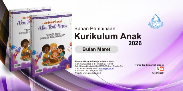 Tema Tahun 2026“Gereja yang Dinamis dan Inovatif” Klik disini untuk mengunduh KATA PENGANTARPuji dan syukur kami panjatkan kepada Tuhan Yesus Kristus, Sang Gembala Agung yang senantiasa menyertai perjalanan gereja-Nya. Atas anugerah dan kasih setia-Nya, buku Kurikulum Anak Sinode GKJ ini dapat tersusun dan hadir sebagai wujud nyata kepedulian gereja terhadap pertumbuhan iman anak-anak, yang adalah generasi penerus kerajaan Allah.Gereja yang sejati bukanlah sekadar tempat berkumpul, tetapi tubuh Kristus yang hidup, bergerak, dan terus bertumbuh. Gereja dipanggil untuk menjadi dinamis — mampu menjawab perubahan zaman — serta inovatif — berani menghadirkan cara-cara baru dalam mewartakan kasih Allah. Dalam semangat itu, pelayanan kepada anak-anak menjadi bagian yang tak terpisahkan dari misi gereja. Anak-anak bukan hanya masa depan gereja, tetapi juga bagian dari gereja masa kini. Mereka bukan sekadar objek pembinaan, tetapi juga agen perubahan yang dapat membawa terang Kristus dalam lingkungan keluarga, sekolah, pertemanan, dan masyarakat sejak usia dini.Buku pembinaan ini disusun dengan tujuan untuk menolong guru Sekolah Minggu dan para pelayan anak dalam mendampingi anak-anak mengenal kasih Tuhan melalui cara yang menyenangkan, kreatif, relevan, dan penuh makna. Materi-materi di dalamnya dirancang sebagai panduan dasar yang fleksibel, yang perlu terus diolah, dikembangkan, dan disesuaikan dengan konteks, dinamika, serta kebutuhan gereja lokal agar dampaknya dapat terasa nyata dalam kehidupan anak-anak maupun komunitas jemaat.Kami menyadari sepenuhnya bahwa buku ini masih jauh dari sempurna. Oleh sebab itu, kritik, saran, dan pengembangan lanjutan dari para pembina, pelayan, dan jemaat sangat kami harapkan demi memperkaya isi dan manfaatnya di masa mendatang. Kiranya buku ini dapat menjadi sarana yang memberkati pelayanan anak, membimbing mereka untuk bertumbuh dalam iman, serta menggerakkan mereka menjadi pembawa perubahan positif bagi gereja dan dunia.Segala kemuliaan hanya bagi Tuhan yang terus berkarya melalui gereja-Nya di tengah dunia.Bidang PWG Bapelsin XXIX KURIKULUM ANAK 2026 IAKU IKUT YESUSDiterbitkan Oleh:Yayasan Taman Pustaka Kristen Indonesia(Anggota IKAPI)Jl. dr. Wahidin Sudirohusodo No. 38A Yogyakarta 55222Telp./Fax.: (0274) 512449; HP/WA: 087838211445E-mail: penerbit@tamanpustakakristen.comWebsite: www.tamanpustakakristen.comBekerjasama dengan:Sinode Gereja-gereja Kristen JawaJl. Dr. Sumardi No. 8 & 10 Salatiga 50711 Bagi Bapak/Ibu/Saudara yang tergerak untuk mendukung pelayanan Sinode GKJ, persembahan dapat disalurkan melalui rekening berikut: Rek: BritAmaBisnis 0081-000589-56-1 a/n Sinode GKJTelp: 0298.326684 Email: sinode@gkj.or.id WA Center: +62 856 4066 6663Website: www.sinodegkj.or.id Penanggung Jawab Bapelsin XXIX GKJ Bidang PWGPdt. Erni Ratna YunitaPdt. Sih Ell MirmaningrumPdt. Kristin AndiniPenulis:Sdri. Yemima Yektining UtamiPdt. Puspita Setyo ArtiPdt. Silvana Dita SusantiPdt. Dane DeaBp. PurnomoPdt. Kris NurPdt. Dina WidiastutiPdt. Devi CarolinaPdt. Dinah Bessdorina MaribungaPdt. Udin Firman HidayatPdt. Debora DwioktabrianiSdr. Pulung Sriyono SanyotoEditor:Pdt. Gledis Yunia Debora AngelitaSdri. Artha KinanthiPdt. Kristin AndiniTata letak & sampul PDILM Sinode GKJ