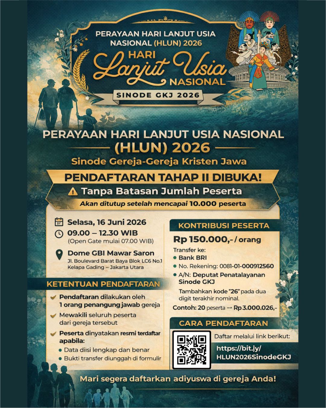 PERAYAAN HLUN 2026 – SINODE GKJ Pendaftaran Tahap II telah dibuka! Mari bersama merayakan Hari Lanjut Usia Nasional (HLUN) 2026 dalam kebersamaan iman dan sukacita pelayanan. 📅 Selasa, 16 Juni 2026⏰ 09.00 – 12.30 WIB📍 Dome GBI Mawar Saron, Kelapa Gading – Jakarta Utara💰 Kontribusi peserta: Rp150.000/orang👥 Tanpa batasan jumlah peserta (ditutup jika mencapai 10.000 peserta) 📌 Pendaftaran dilakukan oleh penanggung jawab gereja masing-masing. 🔗 Daftar sekarang melalui link:https://bit.ly/HLUN2026SinodeGKJ Mari segera daftarkan adiyuswa di gereja Anda dan rayakan usia lanjut sebagai anugerah Tuhan 🌿🙏