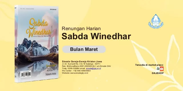 RENUNGAN SADHARSabda Winedhar Maret 2024Mitra Saben Ari Marsudi Ati Tema: Wungunipun Gusti Nganyaraken Lan Mulihaken Gesang Diterbitkan Oleh:Yayasan Taman Pustaka Kristen Indonesia(Anggota IKAPI)Jl. dr. Wahidin Sudirohusodo No. 38A Yogyakarta 55222Telp./Fax.: (0274) 512449; HP/WA: 087838211445E-mail: penerbit@tamanpustakakristen.comWebsite: www.tamanpustakakristen.com Bekerjasama dengan:Sinode Gereja-gereja Kristen JawaJl. Dr. Sumardi No. 8 & 10 Salatiga 50711Rek: BritAmaBisnis 0081-000589-56-1 a/n Sinode GKJTelp: 0298.326684 Email: sinode@gkj.or.id WA Center: +62 856 4066 6663Website: www.sinodegkj.or.id Klik disini Untuk mengunduh Temukan Pengalaman baru Renugan Harian Sadhar didalam genggaman smartphone.Unduh Aplikasi Renungan Harian Sadhar di Playstore, dan nikmati pembacaan renungan harian di kanal youtube Sinode GKJ Pemesanan dan Informasi dapat menghubungi Sinode Gereja-gereja Kristen JawaJl. Dr. Sumardi No. 8 & 10 Salatiga 50711Telp: 0298.326684 Email: sinode@gkj.or.id WA Center: +62 856 4066 6663