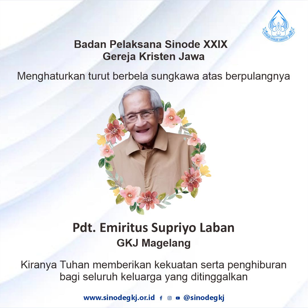 Berita Duka Pdt. Emiritus Supriyo Laban (GKJ MAGELANG) Meninggal dunia, Kamis 22 Februari 2023 Pukul 16.00 WIB Pemakaman Jumat 23 Februari pukul 10.00 WIB Badan pelaksana Sinode XXIX Gereja Kristen Jawa menghaturkan turut berbela sungkawa atas berpulangnya Pdt. Emiritus Suriyono Laban kiranya Tuhan memberikan kekuatan serta penghiburan bagi seluruh keluarga yang ditinggalkan.