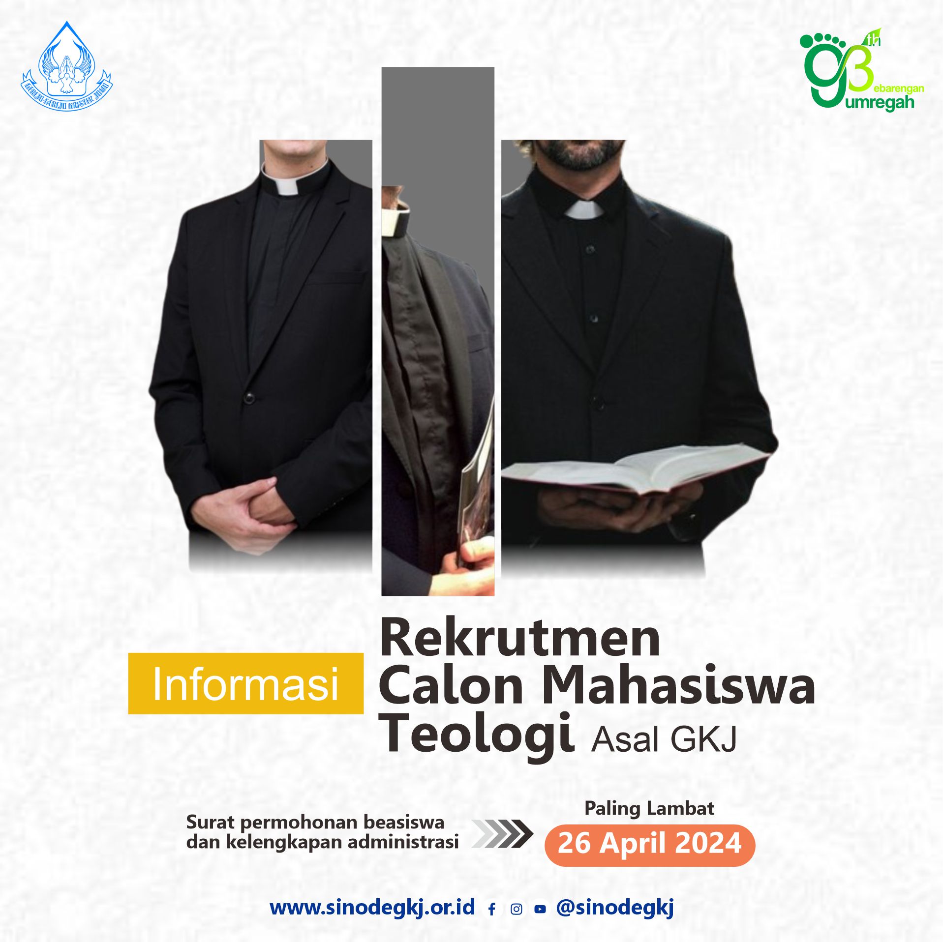 Nomor : SK/2024/B7/SB704/206 Salatiga, 22 Februari 2024 Hal : Rekrutmen Mahasiswa Teologi Asal GKJ Yang Terhormat Segenap Majelis Gereja Kristen Jawa se Sinode GKJ di alamat masing-masing Salam dalam Kasih Tuhan Yesus Kristus, Dalam upaya mendapatkan calon mahasiswa teologi yang bersungguh-sungguh, berdedikasi, memiliki minat, dan komitmen untuk melayani Tuhan melalui jemaat-Nya, maka BAPELSIN XXIX GKJ kembali menyelenggarakan rekrutmen calon mahasiswa teologi asal GKJ yang berhak menerima bantuan beasiswa Sinode GKJ. Pada tahun ini Sinode GKJ akan memberikan bantuan beasiswa bagi mahasiswa baru yang akan studi di sekolah teologi yang didukung oleh Sinode GKJ. Tahapan rekrutmen Calon Mahasiswa Teologi Asal GKJ : Kualifikasi peserta rekrutmen: Syarat Administrasi : Demikian yang dapat kami sampaikan. Atas perhatiannya kami ucapkan terima kasih. Tuhan Memberkati kita.